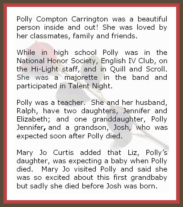 Polly Carrington - Polly Jo Compton Carrington, 52, of Tyler, Texas, native of